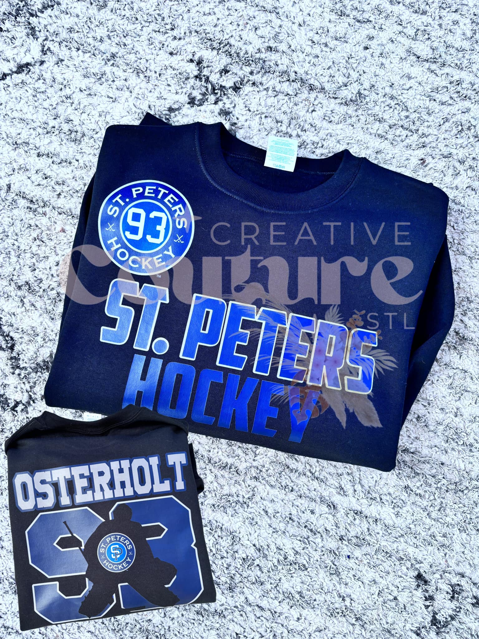 Celebrate hockey pride with our Customized St. Peters Hockey, featuring bold, text and a custom St. Peters Hockey puck design. Complete with your favorite players number in the logo and added to the back with their last name.