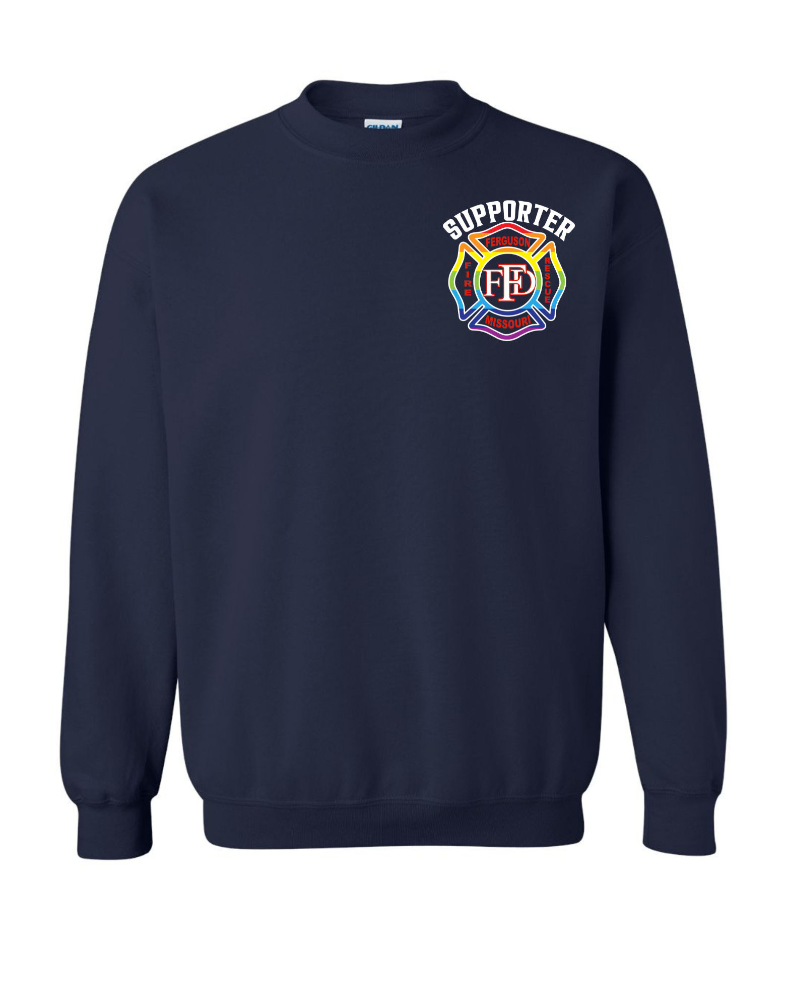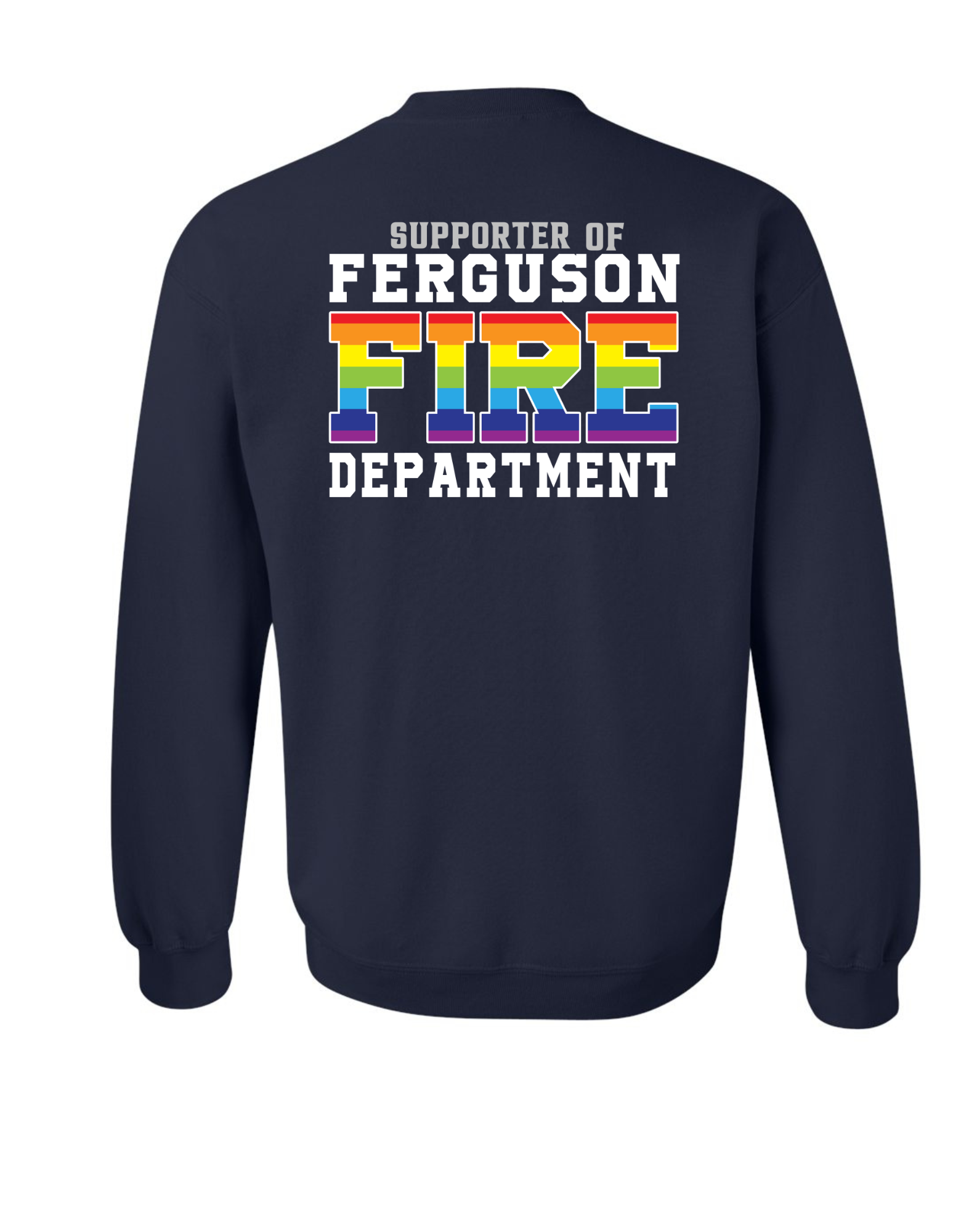 Celebrate your love for all those we love no matter who they love with our Ferguson Fire Rescue PRIDE Crewneck Sweatshirt, featuring this great Fire Department same and bold Supporter above the design with the beautiful rainbow letters and rainbow fire logo.