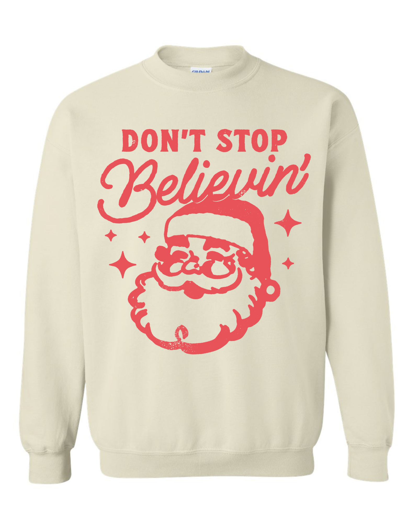 Spread the Christmas cheer this season with this Don't Stop Believin' sand colored crewneck sweatshirt.