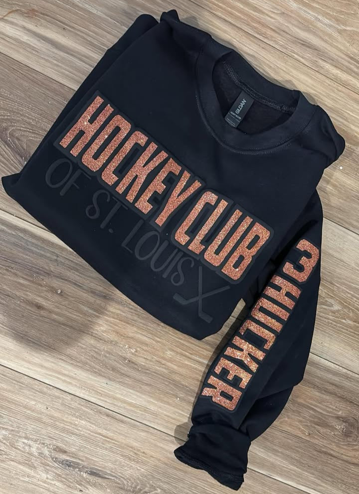 Celebrate your favorite Hockey Club of St. Louis player this season with our new Puff and Glitter Hockey Club of STL Sweatshirt. Add your players first or last name down the sleeve in the beautiful Orange glitter outlined in the beautiful black 3-D puff