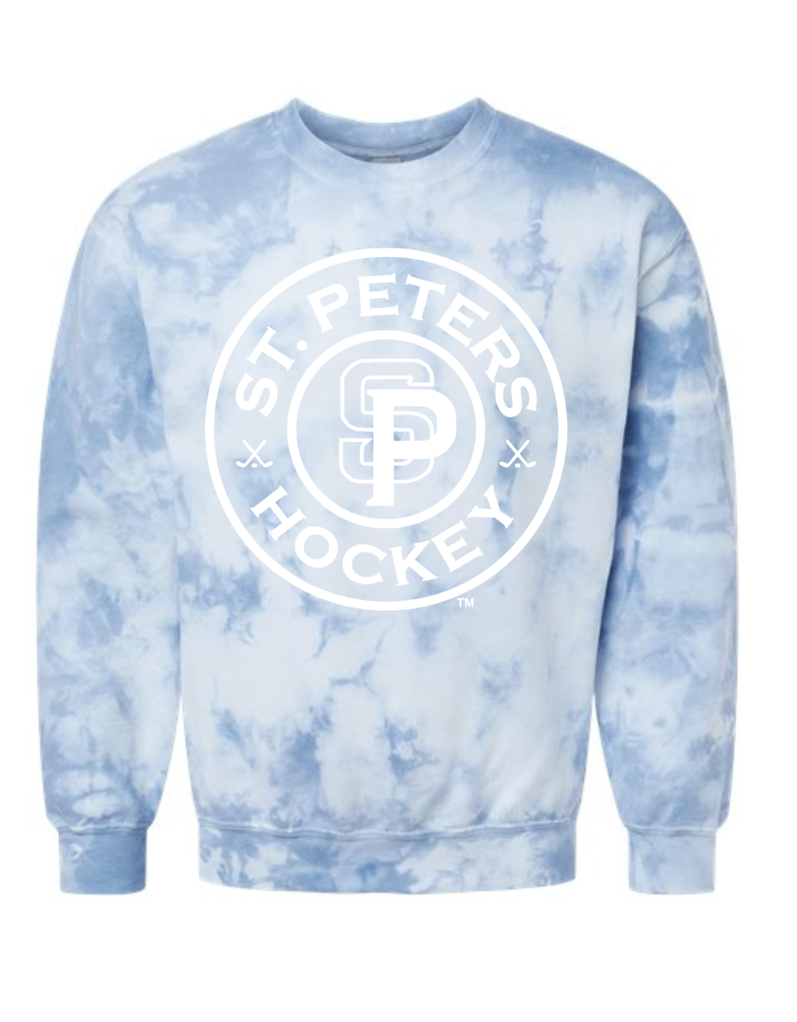 Celebrate your favorite St. Peters Hockey player this season with our new All One Color Logo WHITE LOGO on our popular blue and white tie dye crewneck