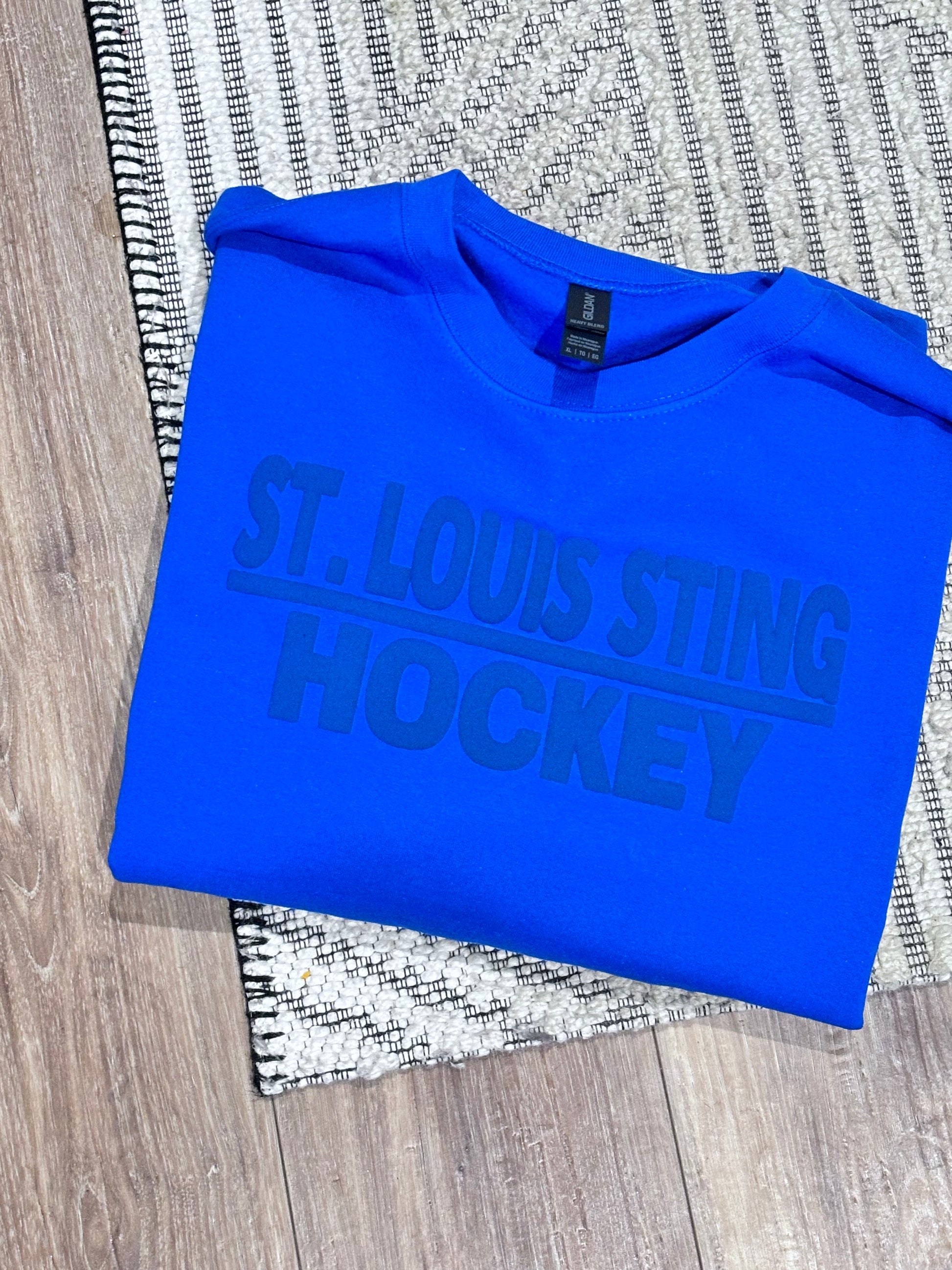 This crewneck sweatshirt available in black on black, Royal on Royal or white on white monochromatic style.