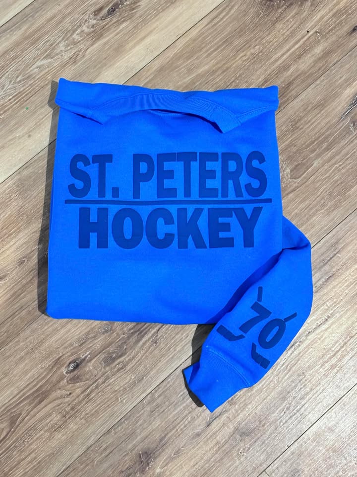 This crewneck sweatshirt available in black on black, Royal on Royal or white on white monochromatic style.